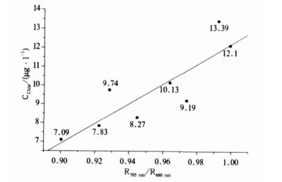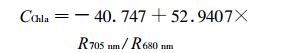 其中, 相关系数R2=0.75, CChla为叶绿素a的浓度, R705 nm/R680 nm为705 nm和680 nm处的反射率比值。此结果与大部分相关文献[12-13]中的结论非常吻合, 甚至系数的差异都很小。