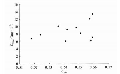 式(3)中, RCh1*, RCh4*, RCh3*为MODIS通道1, 4, 3大气校正后的地面反射率。实际计算中, 对通道4和通道3进行空间尺度处理, 由500 m分辨率变换到250 m分辨率, 所以IChla最终空间分辨率250 m。对2003年1月10日MODIS数据进行分析, 利用大气校正后MODIS通道1, 4, 3的地面反射率建立叶绿素指数IChla, IChla与水体叶绿素浓度监测结果CChla的关系如图 4所示。