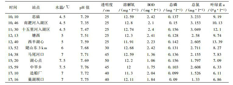 表 1 2003年1月10日巢湖水质参数 Table 1 The water quality parameters of Chaohu Lake on Jan 10, 2003 |