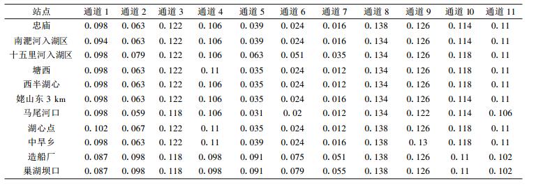 试验站点主要选择巢湖支流的入湖口处, 以及其他有代表性的点, 共计16个。水体采样和水面测量顺序为:忠庙→南淝河入湖区→十五里河入湖区→塘西→西半湖→姥山东3 km→马尾河口→湖心点→中旱→造船厂→巢湖坝口。水质样本分析依据:GB/T6920-86, GB/T11901-89, GB/T7484-87, GB/T7488-87, GB/T7479-87, GB/T11893-89, GB/T11894-89和ISO 10260-1992, 样品采用聚乙烯桶和玻璃瓶密闭封装, 巢湖市环境监测站负责水质采样和处理。由于目前国家标准中没有水质叶绿素测量标准, 所以采用国际标准组织的(ISO 10260-1992)《水质; 生化参数测量; 叶绿素a浓度的光谱测定》, 以丙酮萃取及分光光度计分析的方法测定叶绿素a, 使用仪器为751型分光光度计, 工作于紫外、可见、近红外光谱区, 波长范围200~1000 nm, 采用30°角的利特罗石英棱镜作色散元件, 光程1 m长, 其狭缝0~2 mm连续可调。