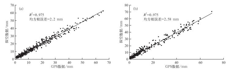 | 图 1. 2004年(a) 和2005年(b) GPS与探空大气水汽总量对比散点图 Fig 1. Scatterplots of PW derived from GPS and radiosondes for 2004(a) and 2005(b) | |