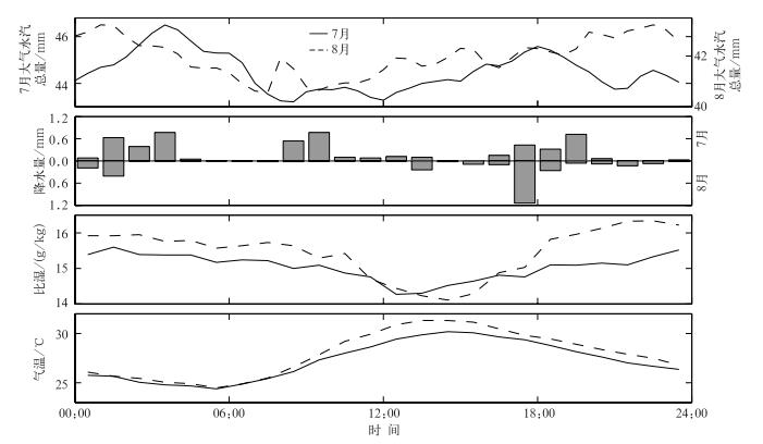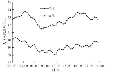 为全面分析北京地区夏季水汽的日变化特征,分别计算了2004—2007年北京地区夏季7, 8月的大气水汽总量,并取4年的平均,结果如图 2所示。由图 2可以看出,7, 8月水汽的极值出现时刻并不完全相同;7月的最小值出现在08: 00左右,03: 00左右出现最大值,18:00左右出现次大值。8月的最小值出现时刻同7月比较接近,出现在08:00—12:00之间;但最大值出现时刻表现出一定的差异,在01:00左右出现最大值。7月和8月白天大气水汽总量整体变化趋势大致相同,夜间变化趋势上表现出一定的差异:7月大气水汽总量在傍晚达到次大值后,有一次明显的下降后回升的过程,在03:00左右达到最大值;8月在18:00左右相对高值之后的下降过程并不是很明显,而后水汽开始上升,在01:00达到最大值。水汽的日变化振幅7月相对大一些,日变化振幅在3 mm左右。