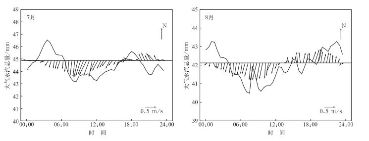 | 图 4. 北京地区2006年7, 8月大气水汽总量和风矢量的日变化对比 Fig 4. Diurnal variation of PW and wind vector in July and August 2006 of Beijing | |