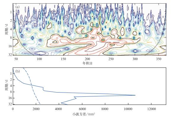 2007年的周期特征如图 6a所示,大体上呈现出与2004年类似的周期特征,只是出现强周期信号的时间向后有所推移,在2004年为年积日110d左右,2007年年积日130d左右。16~32d尺度上的强周期信号的持续时间,在2004年为年积日第150天—第250天,2007年为年积日第180天—第310天。
