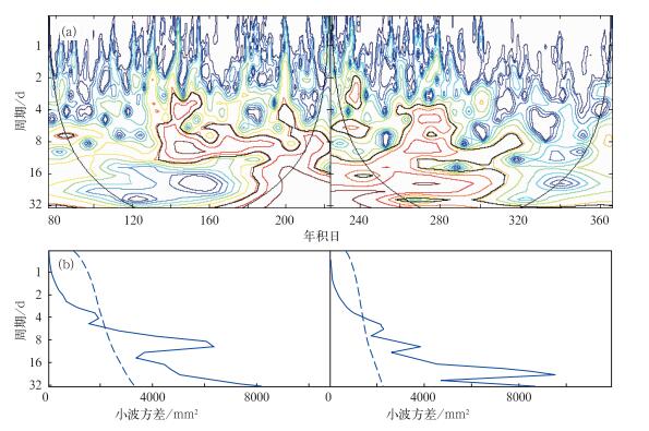 图 5a是2004年大气水汽总量的Morlet小波功率谱。图中数值大于或等于1. 0的等值线(粗黑线) 所包围的范围都通过了显著性α=0.05水平下的红噪声标准谱的检验;曲线范围以内高值区域是影响锥,在该曲线以外的功率谱由于受到边界效应的影响而不予考虑。从图 5a中可以清楚地看到,在大部分时段里存在明显的8~16d的周期变化;在夏季,4d以上时间尺度的周期特征都比较明显;在年积日第250天—第310天有6d左右的周期信号。