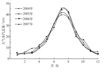 2.5 北京地区大气水汽总量年变化北京地区2004—2007年各月大气水汽总量平均值见图 7, 大气水汽总量4年平均值为17.2 mm。从图 7可以看出,水汽存在明显的年变化,且大气水汽总量的极大值一般出现在7月底8月初。各年月平均大气水汽总量的最大值也存在着年际变化,2005年最高,为45.14 mm; 2004年最低,为39.6 mm。大气水汽总量在一年内的最小值出现在冬季,冬季的各月平均大气水汽总量在5 mm左右,2007年1月的大气水汽总量平均值最小,为3.75 mm。4年数据中大气水汽总量极大值可达到73.6 mm,出现在2005年8月12日;大气水汽总量的极小值可以达到0.5 mm以下,已经低于GPS测量水汽的精度。