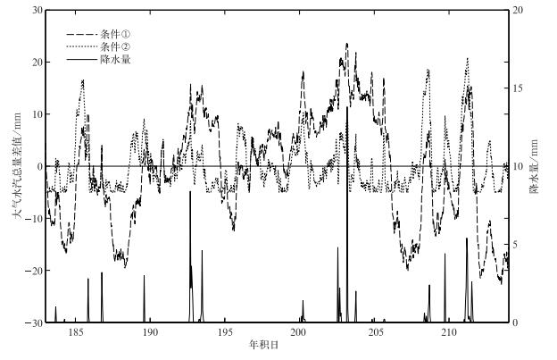 在研究分析大气水汽总量与降水的关系时,应综合考虑天气系统、前期的水汽平均水平、短时的增量和峰值的大小等条件[20]。本文采用前期的大气水汽总量平均值和短时水汽增量两个条件进行降水的判断:①从当前时刻向前滑动12d,取过去12d的大气水汽总量平均值作为阈值(12d是由前面周期分析得到的夏季大气水汽总量主周期),此平均值表征的是前一段时间大气水汽总量的平均状况,将当前时刻的大气水汽总量与这一阈值作差,作为判断有无降水的条件之一;②取过去16h中的大气水汽总量最小值(16h是考虑到北京地区夏季一次降水过程持续时间一般不超过16h),将当前时刻的大气水汽总量与之作差,以差值是否大于5mm作为另一判断有无降水的条件。当这两个条件同时满足时,判断有降水发生。