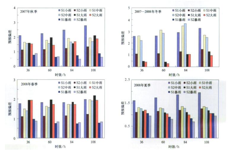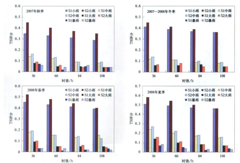 降水预报在夏季尤为重要, 夏季两个方案的TS评分均为4个季节中最高的, 其中36 h小雨预报S2的TS评分是0.58, S1的TS评分是0.51, S2比S1提高了14%, 60 h预报TS评分提高了8%, 84 h提高了6%, 108 h两个方案TS评分相等, 夏季小雨预报S2好于S1。中雨及以上量级的情况是:除60 h以及108 h的暴雨预报S1的TS评分略高于S2, 84 h以及108 h的大雨预报TS评分两个方案相等外, 其余TS评分均为S2高于S1。因此整体上看, 夏季降水预报S2好于S1。