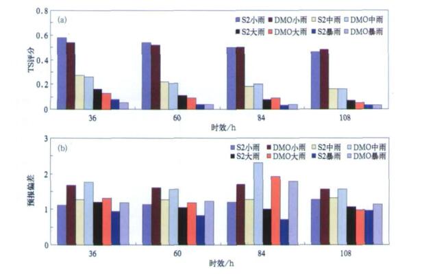36 h预报, 小雨、中雨、大雨和暴雨的TS评分S2都高于DMO预报 (图 3a)。DMO预报偏差较大, 说明预报范围比实况偏大, S2相比较DMO预报的预报偏差有所降低 (图 3b), 除暴雨外, 预报偏差大于且更接近1。漏报率 (图略) 显示36 h预报小雨和中雨S2漏报率大于DMO预报, 表明相对于DMO预报S2的小雨和中雨漏报有所增加, 但是大雨的漏报率小于DMO预报, 而暴雨两者漏报率相等。虽然小雨和中雨的漏报有所增加, 但TS评分提高且预报偏差更接近1, 说明对于36 h预报, S2相比较DMO预报效果有提高。