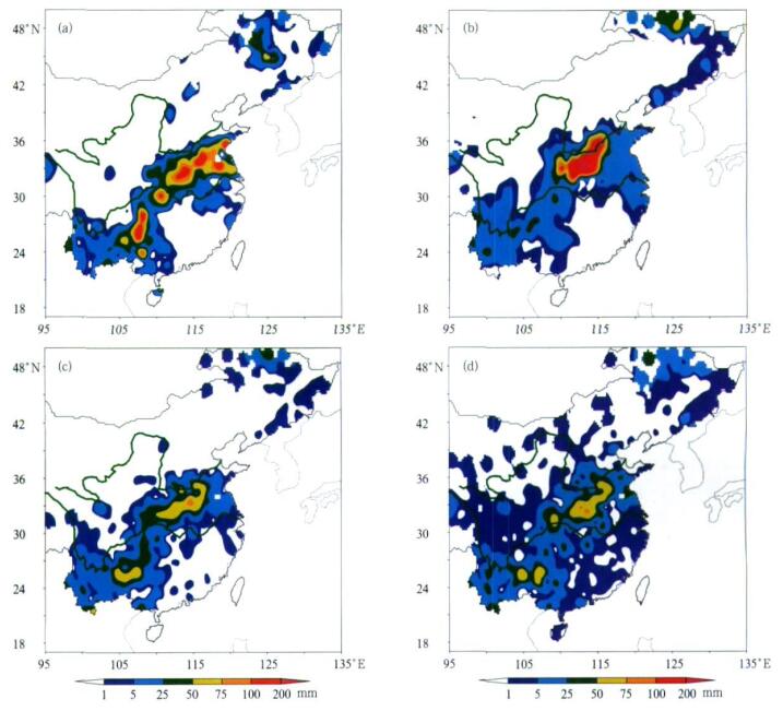 降水实况 (图 4a) 沿江淮流域、长江中游到云南东部、贵州和广西西部是一条明显的降雨带, 有两个明显的降水中心, 一个位于江淮流域, 一个位于贵州到重庆的南部地区, 中心值都大于100 m m, 云南的西部地区有一个相对独立的降雨区域, 其中心值大于25 mm, 另外黑龙江和吉林有一个独立的降水区域, 中心值大于50 mm。
