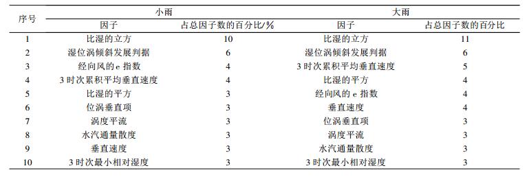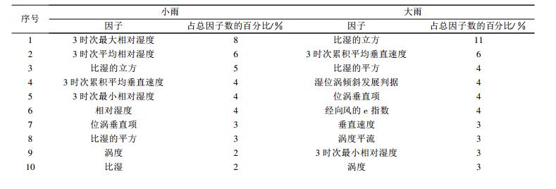 S1的预报因子情况 (表 2) 则不一样, 相比较S2, S1小雨预报因子中动力因子增加, 而且位于前10位的小雨预报因子与大雨预报因子完全一样, 说明在S1中没有很好地反映出大雨与小雨发生的热力和动力条件的差异。