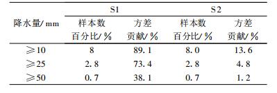 2.1.6 样本方差贡献逐步回归方法选取对预报量方差贡献大、相对独立的预报因子进入预报方程, 因此有必要通过预报量的方差情况进一步分析S1与S2的差异, 尤其是在小雨预报上的差异。