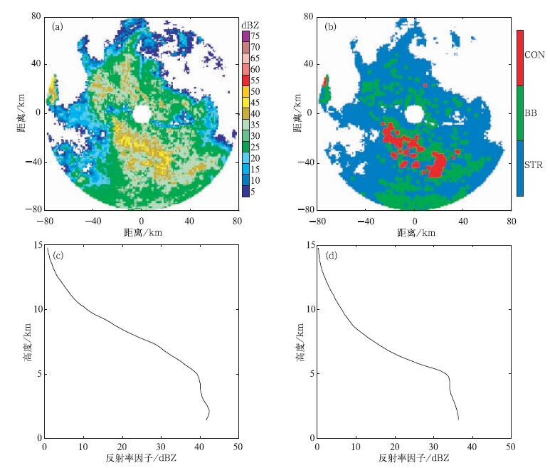 图 3给出了以层状云降水为主的反射率因子图 (图 3a)、降水类型分类图 (图 3b) 和包含零度层亮带的VPR图 (图 3c)。图 3c中的VPR是图 3b中所有确定为零度层亮带的VPR的平均值。从图 3c可以看出,这一VPR与图 1中所示的亮带VPR的概念模型比较一致。图 4给出了对流云降水和层状云降水同时存在的反射率因子图 (图 4a)、降水类型识别图 (图 4b)、对流云降水VPR图 (图 4c) 和包含零度层亮带的VPR图 (图 4d)。从图 4c可以看出,对流云降水的VPR同图 2c给出的VPR类似。图 4d给出的包含零度层亮带的VPR同图 3c给出的亮带的VPR相似。