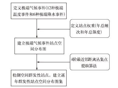 在极端气候事件和权重的定义的基础上, 结合k阶最近邻距离提取算法逐年进行极端气候事件群发区域的检测与提取工作, 检测流程如图 1所示。