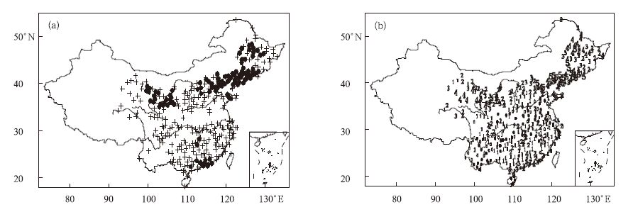 | 图 2. 2000年夏季高温事件的空间分布 (a) 群发提取结果图 (“+”表示发生极端高温事件的站点, “●”表示提取出的群发性站点), (b) 权重分布图 (数字“1” “5”代表所在位置上站点的权重) Fig 2. Stations over China about temperature extremein 2000 (a) cluster distribution ("+"represent the station soccurring temperature extreme, "●"represent the cluster stations occurring temperature extreme), (b) power distribution (number "1"—"5" represent station spower) | |