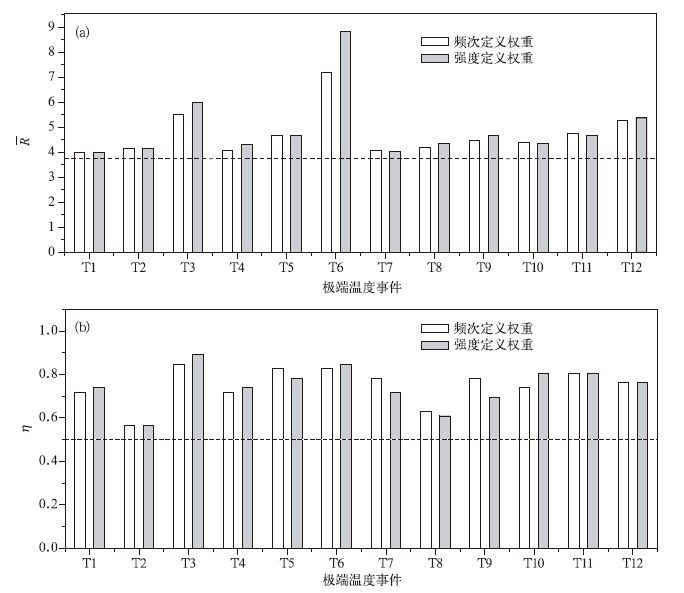 图 3a给出了12种极端温度事件的R, 其中白色的柱状直方图为频次定义权重下的R, 灰色柱状图是强度定义权重下的R, 虚线对应的值是R=3.8。图 3b给出了其各自的有效率η, 和R类似, 频次定义权重的有效率用白色直方图表示, 强度定义权重的有效率用灰色直方图表示, 虚线对应的值为50%的有效率。
