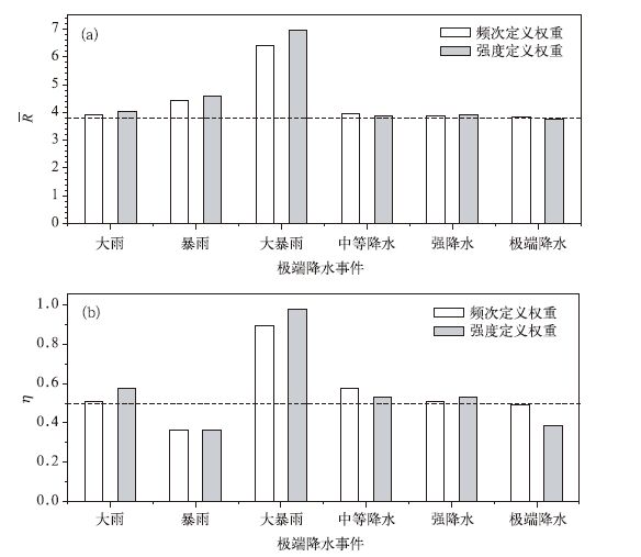图 4a和图 4b分别给出了6种极端降水事件R和η, 虚线分别为R和η的临界值。由图 4可知:较极端温度事件而言, 极端降水事件的有效性稍弱, 大部分R都达到了R的临界值, 除暴雨和极端强降水外, 其余极端降水事件均超过η的临界值。从R和η的大小看, 大暴雨的有效性高于暴雨和大雨; 百分比阈值定义下极端降水事件中, 中等降水和强降水事件的有效性相对较高。对比R和η在临界值以上的几种极端降水事件, 基于强度定义权重的结果略好于基于频次的结果, 但相差甚微。