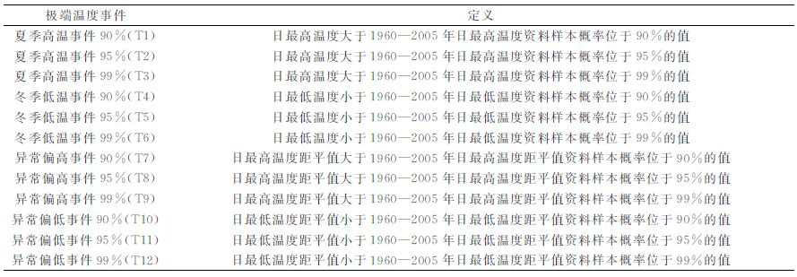 2.2 极端气候事件的定义 2.2.1 极端温度事件的定义本文中极端温度事件的定义为:将某站点1960—2005年的日最高 (低) 温度资料样本概率位于x%(x视实际情况而定) 的值作为极端高 (低) 温事件的上 (下) 阈值, 定义夏季高温 (冬季低温) 事件; 此外, 温度严重偏离 (高于或低于) 该天的多年平均状态, 也可看作是另一种极端高温 (低温) 事件, 即距平值定义异常偏高 (低) 事件。通过控制百分位的取值, 从而定义不同强度的极端温度事件, 共计12种 (表 1)。