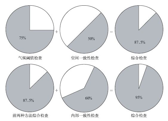 式 (2) 中,P1为气候阈值检查可信度,P2为空间一致性检查可信度,R2为两个可信度的综合可信度。将P1=75%,P2=50%代入式 (2) 得到综合可信度R2为87.5%。