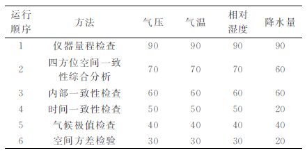 4.1 试用期间的质量控制方案试用期间平台采用的质量控制方法有仪器量程检查、气候极值检查、四方位空间一致性综合分析、内部一致性检查、时间一致性检查和空间方差检验等。这些质量控制模块由不同的研究人员提供,研究人员同时提供各质量控制模块检错可信度的经验值。由平台管理人员编制质量控制模块列表,并保证将平均检错可信度最高的方法优先运行 (表 1)。