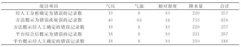 质量控制平台在试用期间,自动保存了各质量控制方法输出的质量控制报告及经综合可信度计算后输出的最终质量控制报告内容。在试用期间同时对气压、气温、相对湿度和降水量资料进行人工质量分析。经过3个月的试运行后,将各质量控制报告中的信息进行统计,并与人工质量分析结果进行比较,得到表 3所示的统计结果。