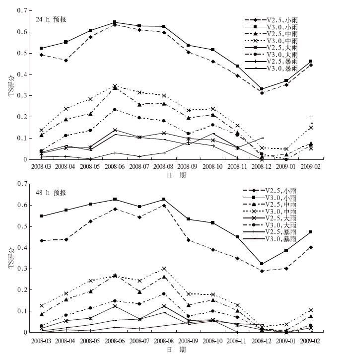 2 降水检验 2.1 逐月加密累加检验从逐月平均降水预报加密累加检验结果 (图 1) 来看,对于24h预报,V3.0模式对于小雨、中雨和大雨预报评分明显高于V2.5模式。对于暴雨除了2008年9月外,V3.0模式预报评分也均高于V2.5模式。V2.5模式对于大暴雨基本没有捕捉能力,其中V3.0模式在6-10月的预报明显好于V2.5,对于部分大暴雨也具有一定的预报能力。对于48h预报,V3.0模式对小雨、大雨和大暴雨预报的改善也很明显,TS评分均高于V2.5模式。除2008年6月外,V3.0模式中雨预报的TS评分也明显高于V2.5。除9月和10月外,V3.0模式暴雨预报评分也高于V2.5模式。
