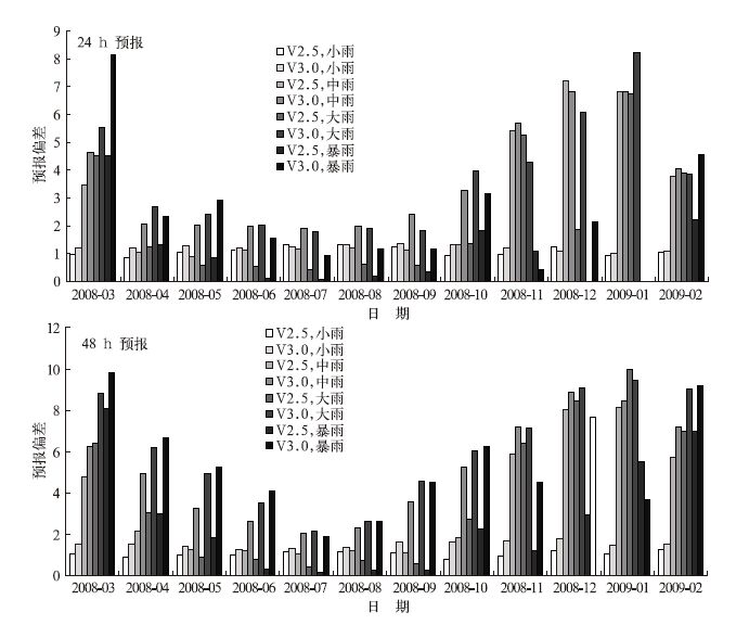 进一步分析预报偏差发现 (图 2),除2009年1月48h的大雨和暴雨预报外,V3.0模式对于中雨以上降水的预报偏差明显偏大,降水量较实况偏大。尤其是秋、冬季大雨以上降水偏大显著,48h预报甚至在春季空报也显著增多。