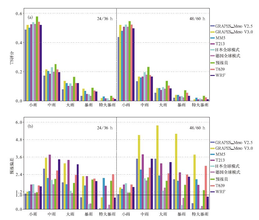 与国家气象中心运行的WRF模式相比,GRAPES_Meso V3.0模式TS评分基本都高于WRF,但48h的预报偏差明显比WRF模式还大,空报或过量预报较多。