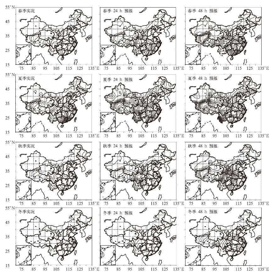 2) 从季节平均降水率分布及全国平均逐日降水率演变来看,24h预报对秋、冬季我国东部降水预报明显偏小有了很大改进,春、夏季强降水中心位置与实况更接近,降水中心强度预报也好于V2.5模式,但是48h预报降水量明显偏大,尤其是2009年2月下旬偏大显著。