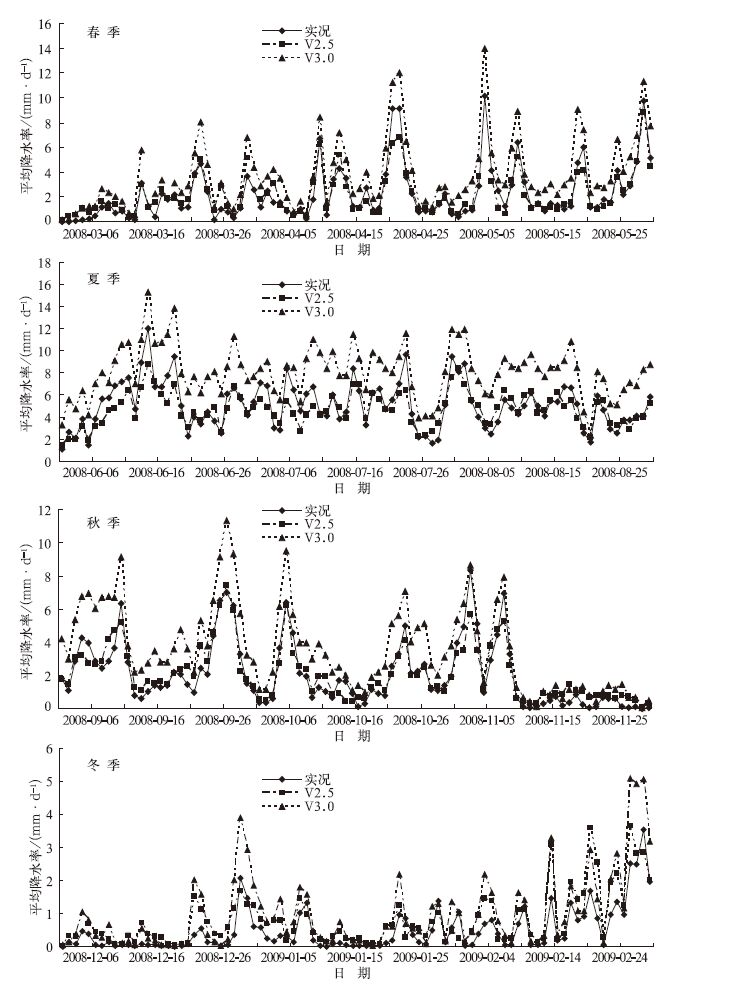 | 图 5. 2008—2009年不同季节GRAPES_Meso V2.5与V3.0模式24 h预报全国平均降水率逐日变化 Fig 5. The time variation of observational and 24-hour forecast rainfall rate of GRAPES_Meso V2.5 and V3.0 models for Chinese dense observation from March 2008 to February 2009 | |