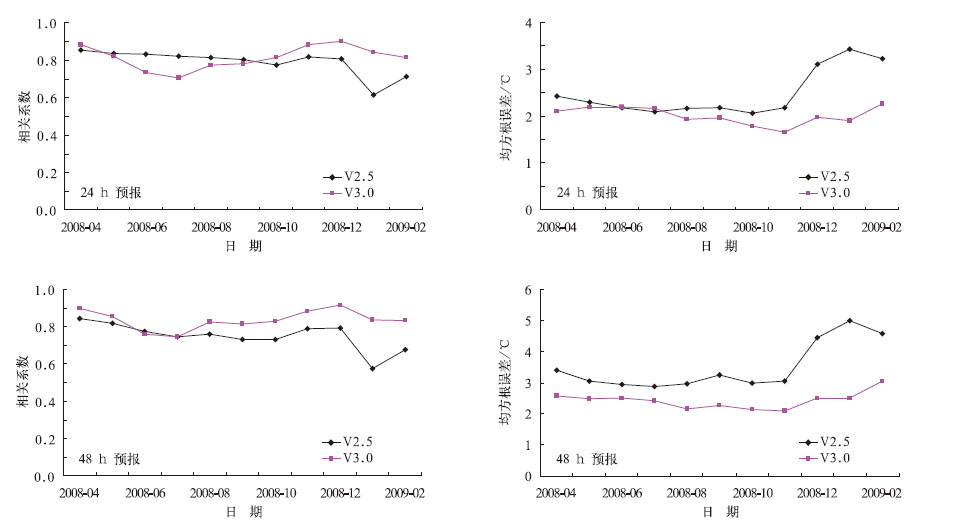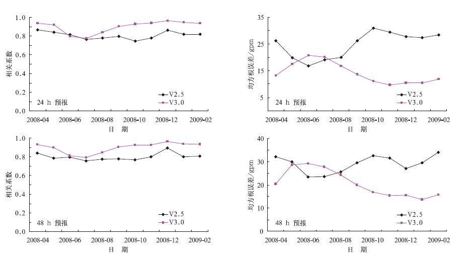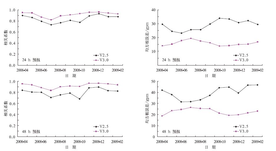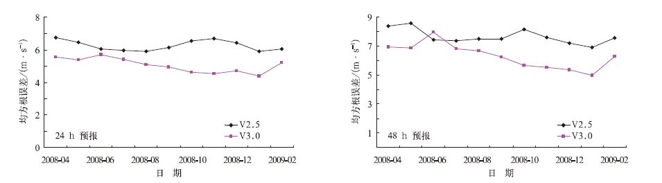 从均方根误差来看,对于24h预报,2008年5-7月两个版本误差水平相差不大,其他月份V3.0模式的误差小于V2.5模式,尤其对2008年12月-2009年2月期间,两种方案有较大的差距。对于48h预报,V3.0模式的误差在所有月份都高于V2.5模式,和24h预报相似,对2008年12月-2009年2月的预报,两种版本有较大差距。