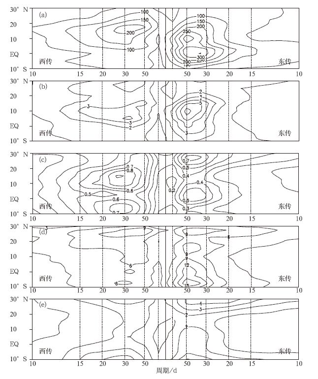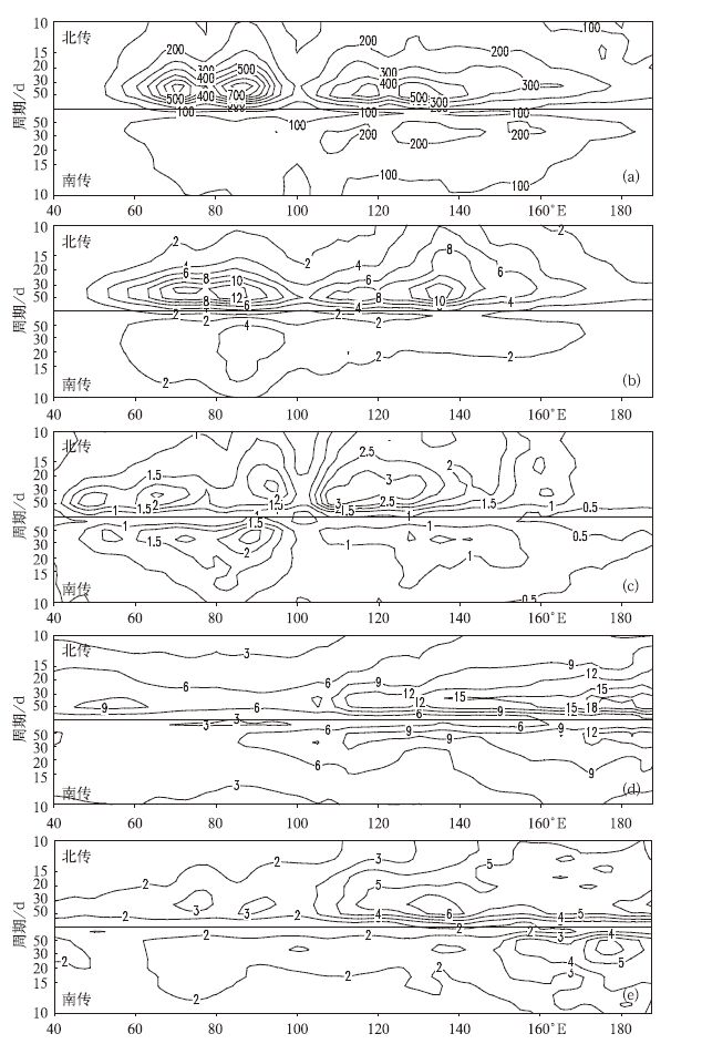 | 图 2. 夏季 (5—10月) 北传模态与南传模态经向一波 (5°S 25°N) 谱分布 (a) OLR, (b) 850 hPa纬向风, (c) 850 hPa经向风, (d) 200 hPa纬向风, (e) 200 hPa经向风 Fig 2. Northward and southward propagating BSISO spectrum during boreal summer (May—October) for meridional wavenumber-1 (5°S—25°N) (a) OLR, (b) 850 hPa zonal wind, (c) 850 hPa meridionalwind, (d) 200 hPa zonal wind, (e) 200 hPa meridionalwind | |