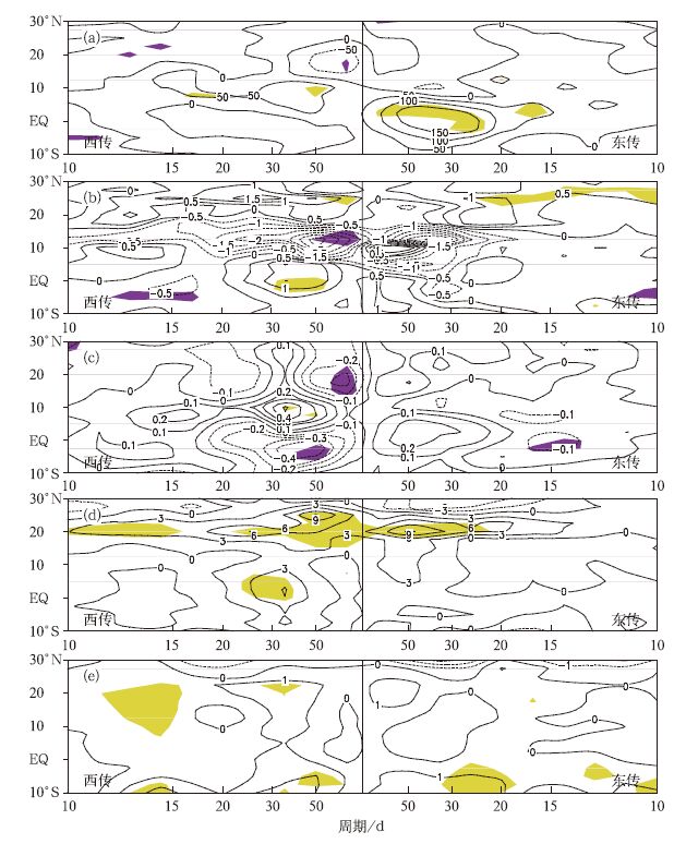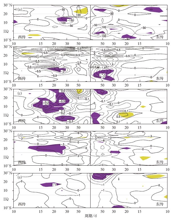 | 图 5. 夏季 (5—10月) 纬向一波西传波与东传波功率谱在El Niña衰减年与La Niñna衰减年之差值 (阴影区表示通过0.05显著性检验) (a) OLR, (b) 850 hPa纬向风, (c) 850 hPa经向风, (d) 200 hPa纬向风, (e) 200 hPa经向风 Fig 5. Energy spectrum difference of the zonal wavenumber-1 westward and eastward propagating BSISO between El Niña decaying summer (May—October) and La Niñna decaying summer (the shade darea denotes passing the test of 0.05 level) (a) OLR, (b)850 hPa zonalwind, (c) 850 hPa meridionalwind, (d) 200 hPa zonalwind, (e) 200 hPa meridionalwind | |