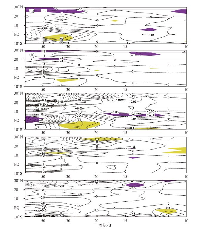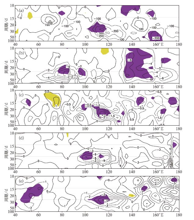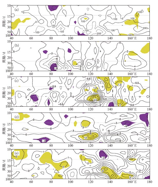 | 图 6. 夏季 (5—10月) 经向一波北传波功率谱在El Niño衰减年与LaNiñna衰减年之差值 (阴影区表示通过0.05显著性检验) (a) OLR, (b) 850 hPa纬向风, (c) 850 hPa经向风, (d) 200 hPa纬向风, (e) 200 hPa经向风 Fig 6. Energy spectrum difference of the meridional wavenumber-1 northward propagating BSISO between ElNiño decaying summer (May—October) and La Niñna decaying summer (the shaded area denotespassing the test of 0.05 level) (a) OLR, (b)850 hPa zonalwind, (c) 850 hPa meridionalwind, (d) 200 hPa zonalwind, (e) 200 hPa meridionalwind | |