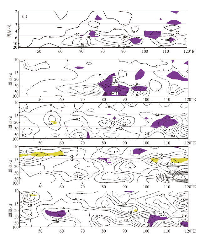 | 图 8. 夏季 (5—10月) 经向一波北传BSISO谱正偶极子年与负偶极子年之差 (阴影区为通过0.05显著性检验)(a) OLR, (b) 850 hPa纬向风, (c) 850 hPa经向风, (d) 200 hPa纬向风, (e) 200 hPa经向风 Fig 8. Energy spectrum difference of the meridional wavenumber-1 northward propagating BSISO between positive dipole summer (May—October) and negative dipole summer (the shaded area denotes passing the test of 0.05 level) (a) OLR, (b) 850 hPa zonal wind, (c) 850 hPa meridional wind, (d) 200 hPa zonal wind, (e)200 hPa meridional wind | |