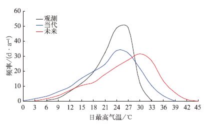 | 图 3. 区域模式模拟华北地区当代和未来4—9月日最高气温的频率分布 Fig 3. Frequency of dailymaximum temperature from April to September over North China | |