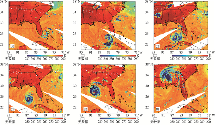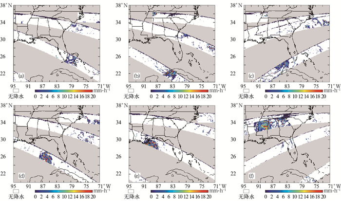 对热带气旋的近地面降水和降水垂直廓线特征统计分析中,样本范围根据以下原则确定:根据图 1确定台风中心,从PR资料中提取包括台风中心周围约5°范围内的所有可得到的样本,经纬度范围会根据图 1中的微波图像所示的降水区适当调大或调小0.5°或1°。每个时次数据所取热带气旋的范围, 图 2a为24°~28.5°N,75.5°~79.5°W;图 2b为22°~26.5°N,81°~88°W;图 2c为20°~26°N,80°~87°W;图 2d为23°~28°N,83°~88°W;图 2e为31°~35°N,82°~93°W;图 2f为27°~32°N,83.5°~91°W。