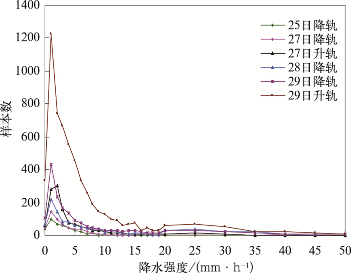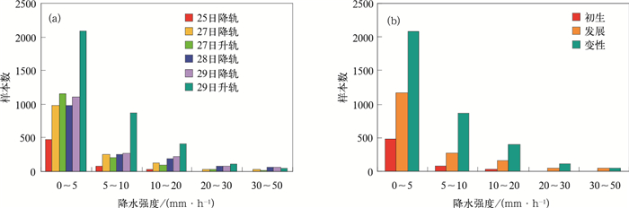 由图 6和图 7还可以发现,降水强度较大的垂直廓线比降水强度较小的垂直廓线不均匀,这一方面与降水强度大对应更强的对流强度、因而垂直方向更不均匀外,还因为降水强度大的降水像元较少 (图 8)。计算发展阶段样本平均廓线 (图 9),比较图 9与图 6和图 7中的发展阶段廓线可以看出,样本数较多 (图 9) 的平均降水垂直廓线更加平滑。
