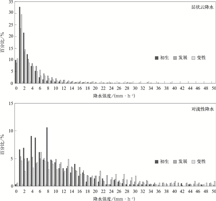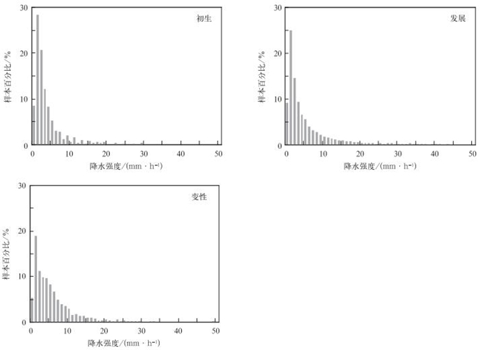 图 5是热带气旋不同阶段其影响区域TRMM/PR 2 km高度降水直方图,由图 5可以看出:层状云降水除个别像元降水强度达到了20~30 mm·h-1外,大多降水强度分布在10 mm·h-1以下的区域,尤其以降水强度介于1~5 mm·h-1像元居多;初生阶段的较强降水像元较另外两个阶段少。对流性降水较层状云降水强度的分布范围大,强度为2~50 mm·h-1的降水像元都存在,降水分布较层状云降水均匀,其中以强度为2~25 mm·h-1的最多;初生阶段对流性降水强度小于9 mm·h-1的较多,发展和变性阶段对流性降水强度较高,其中又以变性阶段的强降水像元最多。