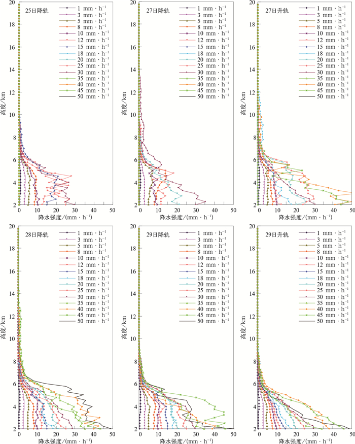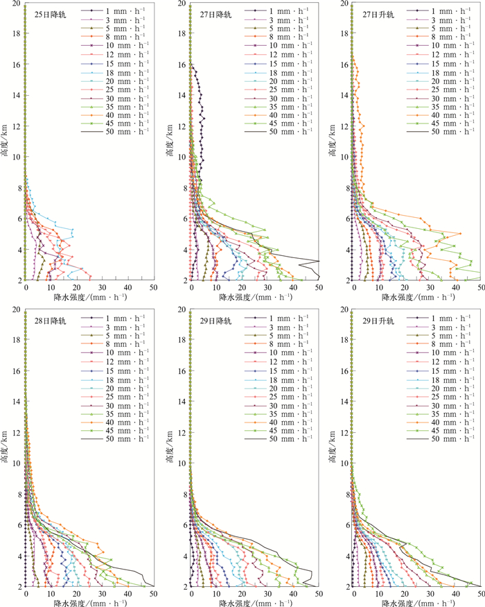 大部分降水廓线随高度升高呈现先略增大再减小的趋势,这是因为在4 km以上雨滴下降过程中,小雨滴碰并增长,与固态 (冰相、雪相) 粒子的融化作用使得降水强度有所增加;而在4 km高度以下,随着下落过程中温度升高,部分雨滴蒸发成水汽,从而使得近地面降水反而减小。
