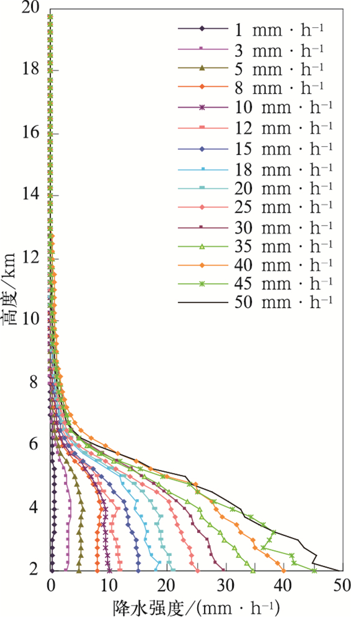 由于2 km高度以下容易受到地物干扰,因此分析热带气旋影响区域2 km高度以上的降水平均廓线。平均廓线的获取方法:对1~19 mm·h-1强度的降水,以1 mm·h-1为间隔,取2 km高度处降水强度在±0.5 mm·h-1范围的所有降水廓线的平均;对20~50 mm·h-1强度的降水,以5 mm·h-1为间隔,取2 km高度处降水强度在±2.5 mm·h-1范围的所有像元降水廓线的平均。