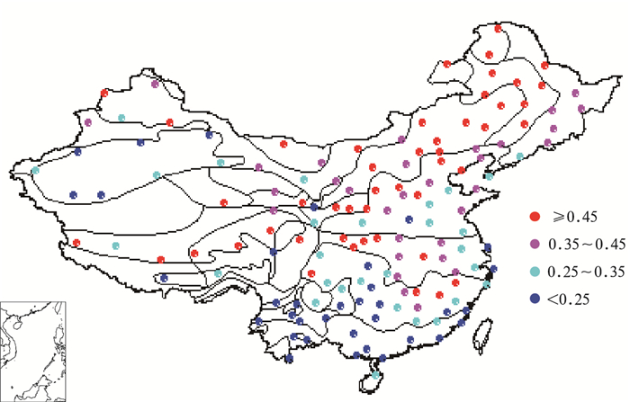 由于气候区面积较大,单个站点对气候区的解释方差远远低于对其周围窗区的解释方差,最大值也不足0.7。根据解释方差的数值分布,将站点划分为4类 (如图 5所示)。解释方差超过0.45的站点表明其对所在气候区的代表性很好,主要分布在北方地区;解释方差介于0.45和0.25之间的站点主要分布在中东部,其中解释方差略高 (介于0.35和0.45之间) 的站点更靠近北部和中部地区,解释方差略低 (介于0.25和0.35之间) 的站点更靠近南部和东部地区;解释方差低于0.25的站点表明其对所在气候区的代表性很差,主要分布在气候类型复杂的西南和新疆部分地区,说明在这些地区有必要设立更多的站点。