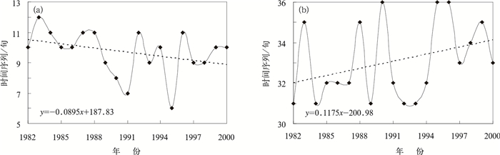 | 图 3. 1982—2000年生长季开始时间 (a) 和结束时间 (b) 变化曲线 Fig 3. Changing curve on the beginning time (a) and ending time (b) of growth season from 1982 to 2000 | |