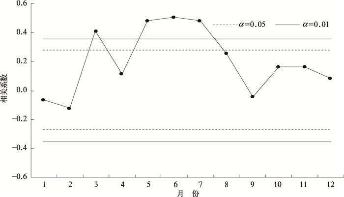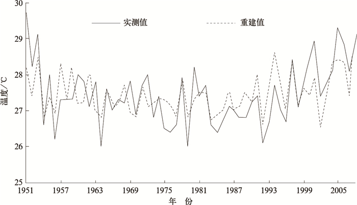 重建方程的相关系数R为0.67,在校准期内,58年的重建值对实测值的解释方差R2为44.9%,调整自由度后解释方差Radj2为43.9%,F=45.63,P<0.00001。由图 3可知,重建值与实测值有较好的同步性。