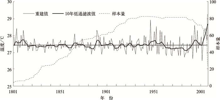 7 结论1) 贺兰山油松年轮早材平均密度对油松生长季5—7月平均最高温度有良好的响应, 用树轮早材平均密度差值年表来重建贺兰山北部1801—2008年5—7月平均最高温度, 能够获得稳定、可靠的重建结果。