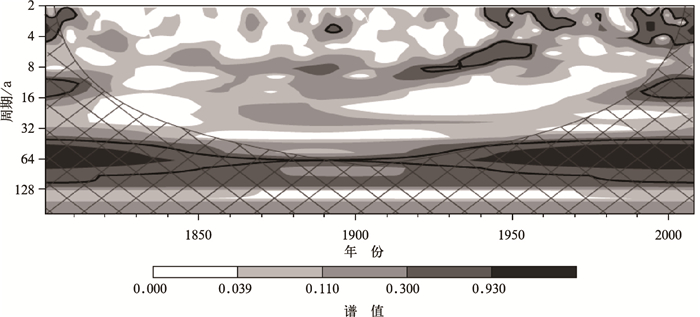 采用多窗谱分析方法[38-40]对温度重建序列进行周期分析。贺兰山北部温度重建序列存在120年 (达到0.05显著性水平)、8.1年 (达到0.05显著性水平)、6.5年 (达到0.1显著性水平)、3.2年 (达到0.05显著性水平)、2.9年 (达到0.05显著性水平)、2.1年 (达到0.05显著性水平) 的准周期变化。为进一步了解重建序列的周期时域变化特征,对重建序列进行小波分析,本文采用的是Morlet小波,计算时采用对称延伸法[41]消除小波变换的边界效应。通过对图 5的观察,并以世纪为尺度计算小波方差,发现2~8年的短尺度振荡贯穿整个时段,但不同时间段,最强振荡频率也不同。1801—1899年这个时段的中期5~10年与30~50年的振荡都不同程度减弱,变化幅度减小,15~25年的振荡较为明显。1900—2008年,50~60年的尺度振荡明显增强,振幅加大,8~10年的振荡在逐渐减弱,相反2~6年和12~15年的振荡在增强。