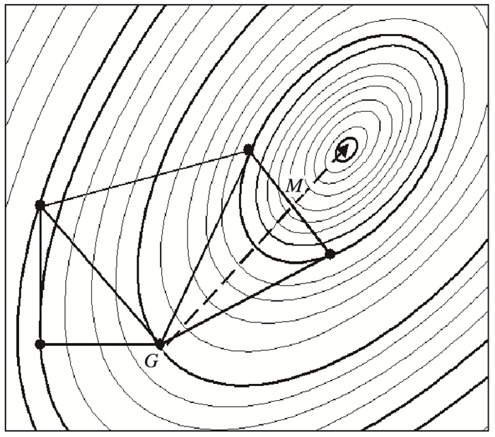 1.2 改进算法为了避免原有NMS算法中存在的问题,可以将此算法中的反射点、扩展点、压缩点以及收缩点的计算转化成使用适应参数计算最佳点的方法,这与最陡梯度算法和Powell算法中计算下一个迭代点的方法相同,但此时查找最小值点的方向为NMS算法的下山方向,即最大值的点G与中点M的连线方向 (图 1)。