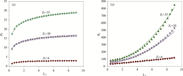 图 2显示的是对于热带阔叶林关于地面零平面位移D0和空气阻力原始计算数据点及其拟合曲线。在本示例中,分别取植被高度Z2=4 m,Z2=20 m和Z2=35 m,并按线性等间隔取ILA的值,由原始的计算D0和Rd计算公式,得到原始数据点,由图中的点表示。在进行曲线拟合之前,绘制原始数据点,通过原始数据的变化情况,合理地设计拟合D0和Rd的数学模型,分别设置为