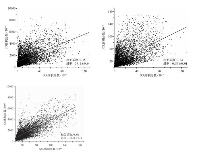 | 图 2. 固城站CO, SO2和NOx关系图 Fig 2. Correlations among CO, SO2 and NOx at Gucheng Station | |