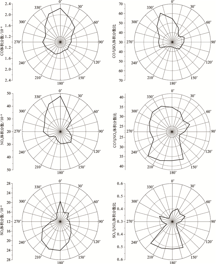 风既能输送污染物,又能使污染物与空气混合,降低其体积分数,因而风对大气污染物体积分数的变化起很大作用,是大气污染研究中的重要影响因子。图 3是固城污染物体积分数及体积分数比的风向玫瑰图。从北和北偏西来的风对应的CO,NOx体积分数,CO与SO2体积分数比相对高而SO2与NOx体积分数比相对低,北京城区刚好在固城的东北方,受城市机动车排放影响的空气含有相对多的CO和NOx和相对少的SO2。南和西南方向SO2体积分数,SO2与NOx体积分数比相对高而CO与SO2体积分数比相对低,固城的西南方最近的污染区是保定市 (距固城大约35 km,人口大约105万),保定郊区有火电厂,其排放的的高体积分数比的SO2的输送可能是偏南风条件下固城低CO与SO2体积分数比和高SO2,SO2与NOx体积分数比的原因。SO2体积分数随风向的分布与CO及NOx的完全不同,说明CO和NOx很可能来自同一排放源,而与SO2同源性较差。CO和NOx小时平均体积分数的相关系数为0.61,而SO2与CO和NOx的小时平均体积分数间的相关系数分别为0.35和0.34。南风方向CO与NOx体积分数比最大,其次是西北风方向,但二者差异较小。固城站位于华北平原的农业区,其周围主要是农田以及相对均匀分布的村镇。在这样的地区,秸秆等生物质是燃烧的重要原料。高CO与NOx体积分数比可能与当地农村日常生活的生物质燃烧有很大关系,而这种燃烧源在各个方向的分布差异相对较小。固城站地面主导风向是西南风和东北风[15-16],保定和北京城区刚好处于其主导风向的上、下风向,一次污染物随风向的变化特征可能正体现了两类不同气团来源的污染特征。